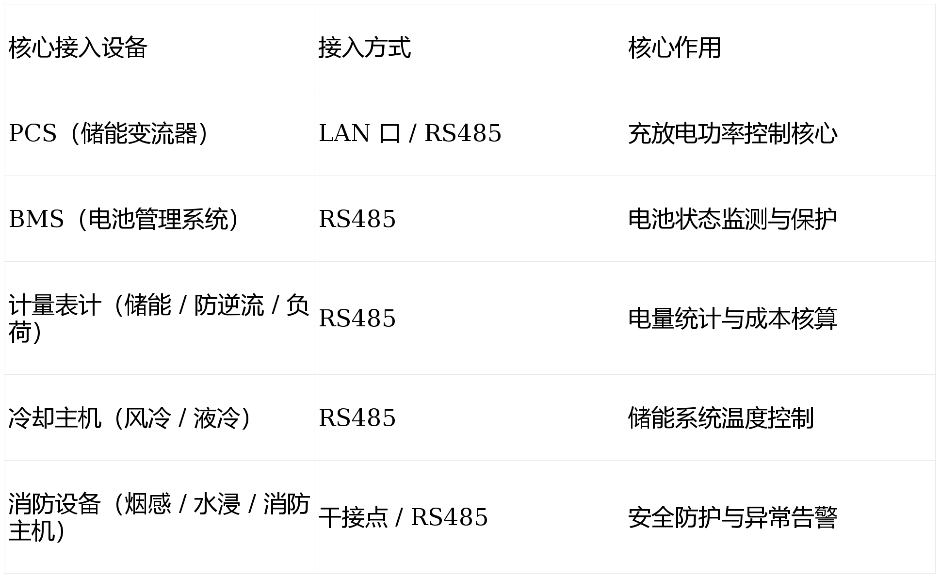 系統(tǒng)支持 PCS、BMS、電表、溫控設(shè)備、消防系統(tǒng)等 12 類核心設(shè)備接入,涵蓋必裝與選裝配置,適配盛弘、匯川、高特、安科瑞等主流品牌。接口豐富且協(xié)議全面,支持 RS485、TCP/IP、4G(選配)等通信方式,兼容 IEC101/103/104、MODBUS RTU/TCP 及私有協(xié)議,可通過直采、通訊管理機(jī)或串口服務(wù)器靈活組網(wǎng),滿足不同儲(chǔ)能設(shè)備的接入需求。